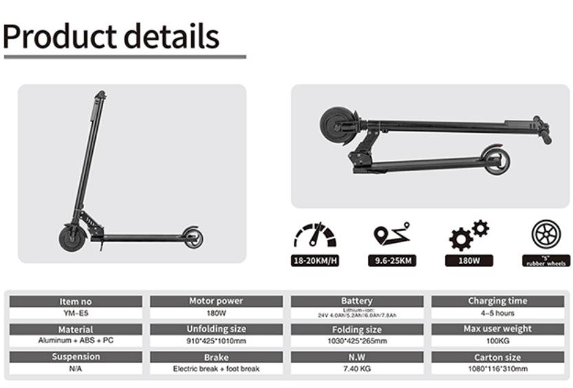 YM-E5 Foldable Speed Adjustable 180W High Endurance Stable Electric Scooter