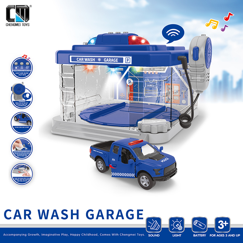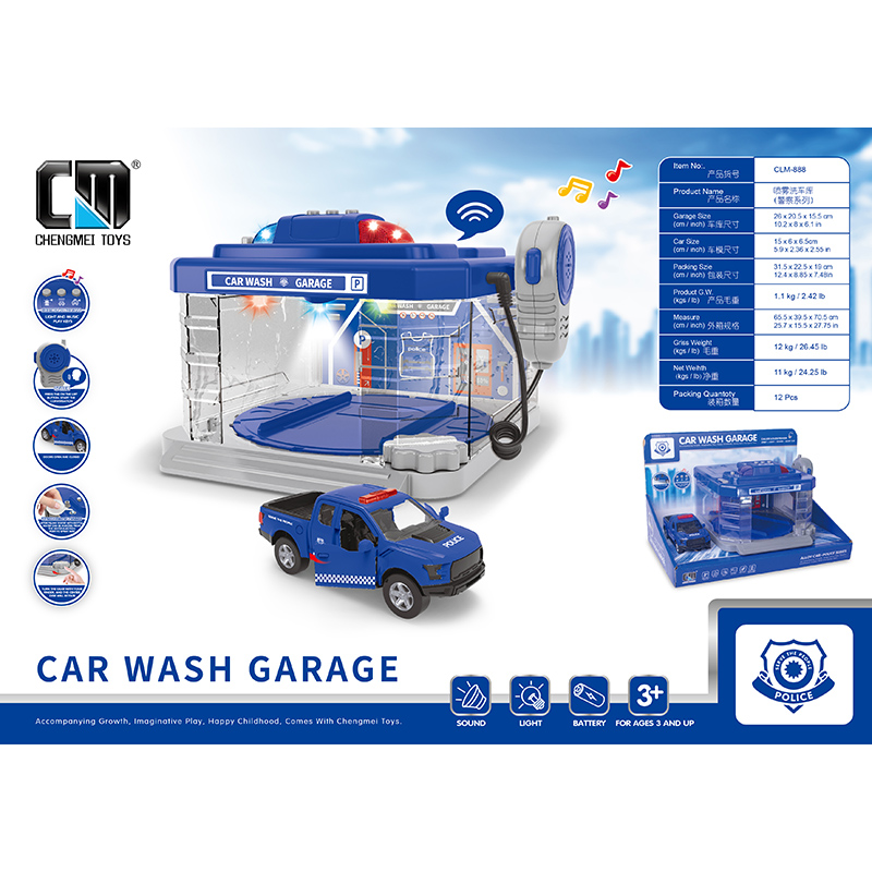 Water spray car wash room with metal car -police