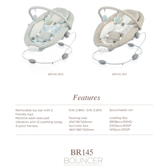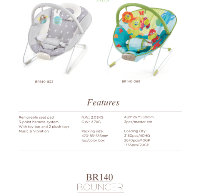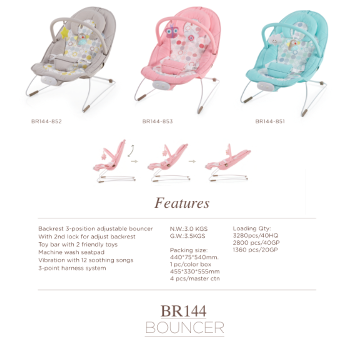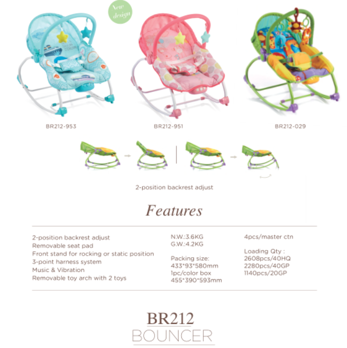 BOUNCER,Backrest 3-position adjustable bouncer With 2nd lock for adjust backrest Toy bar with 2 friendly toys
