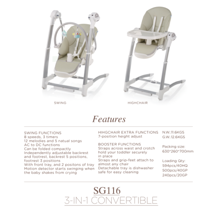 3-IN-1 CONVERTIBLE High Chair,8 speeds, 3 timers,12 melodies and 5 natual songs,AC to DC functions