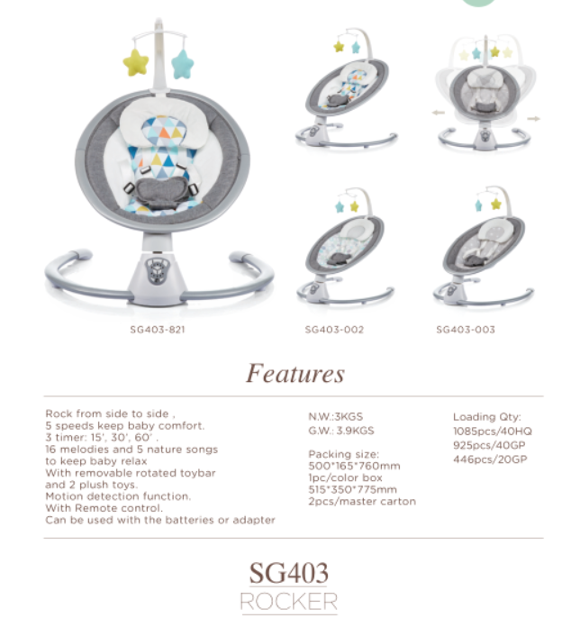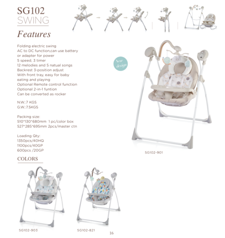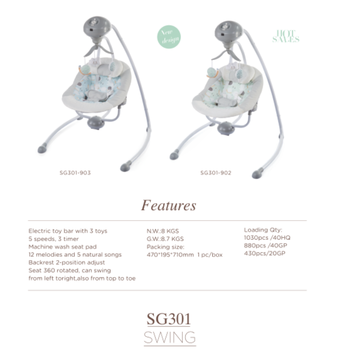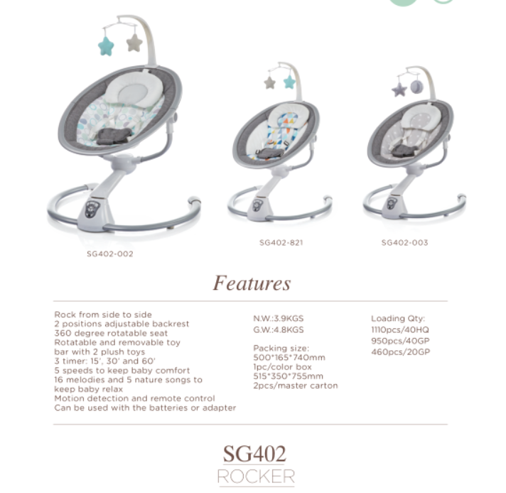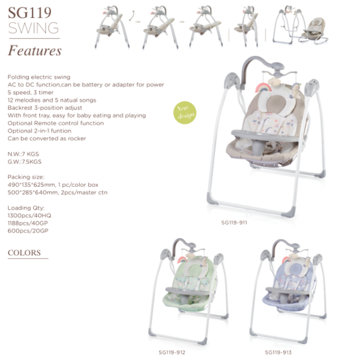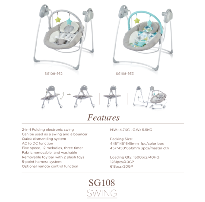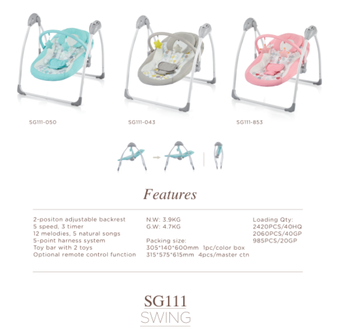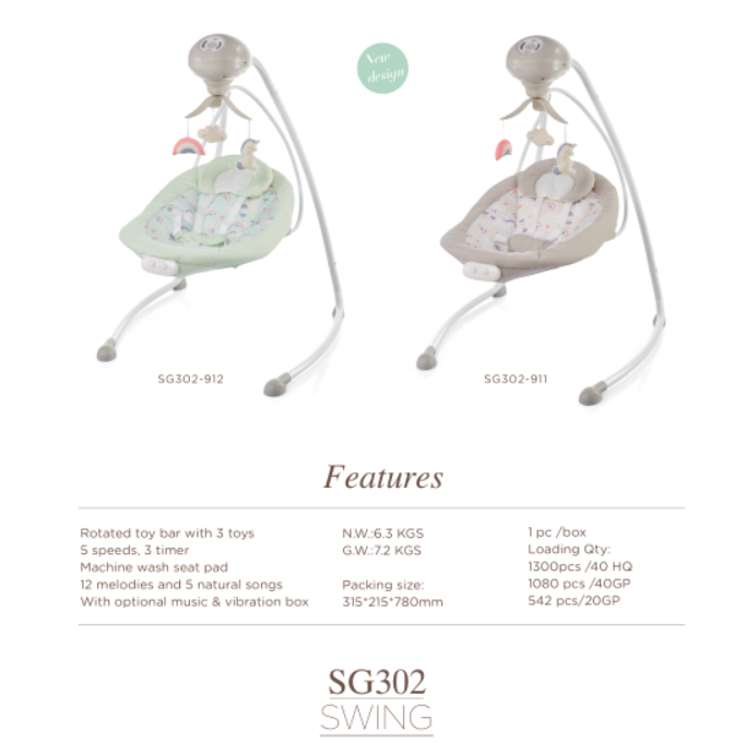 SWING,2-positon adjustable backrest 5 speed, 3 timer 12 melodies, 5 natural songs