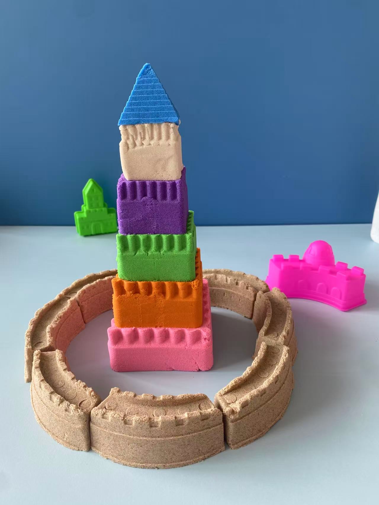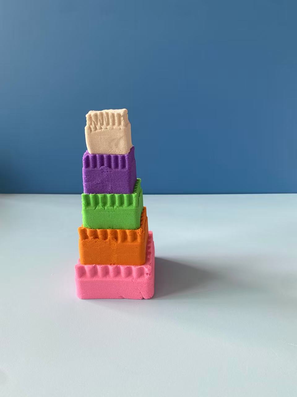 Space sand has a magical texture that provides an extreme sense of relaxation. It is easy to shape; simply press it into the desired form. It is safe and healthy, so moms can feel at ease. The high-quality ingredients consist mainly of 98% natural sand and 2% food-grade polymer. It is non-toxic, odorless, safe, and reliable. The sand has a fine texture, is soft, and comes in a variety of colors. It can be used in educational settings to help children learn about shapes, colors, and structures.