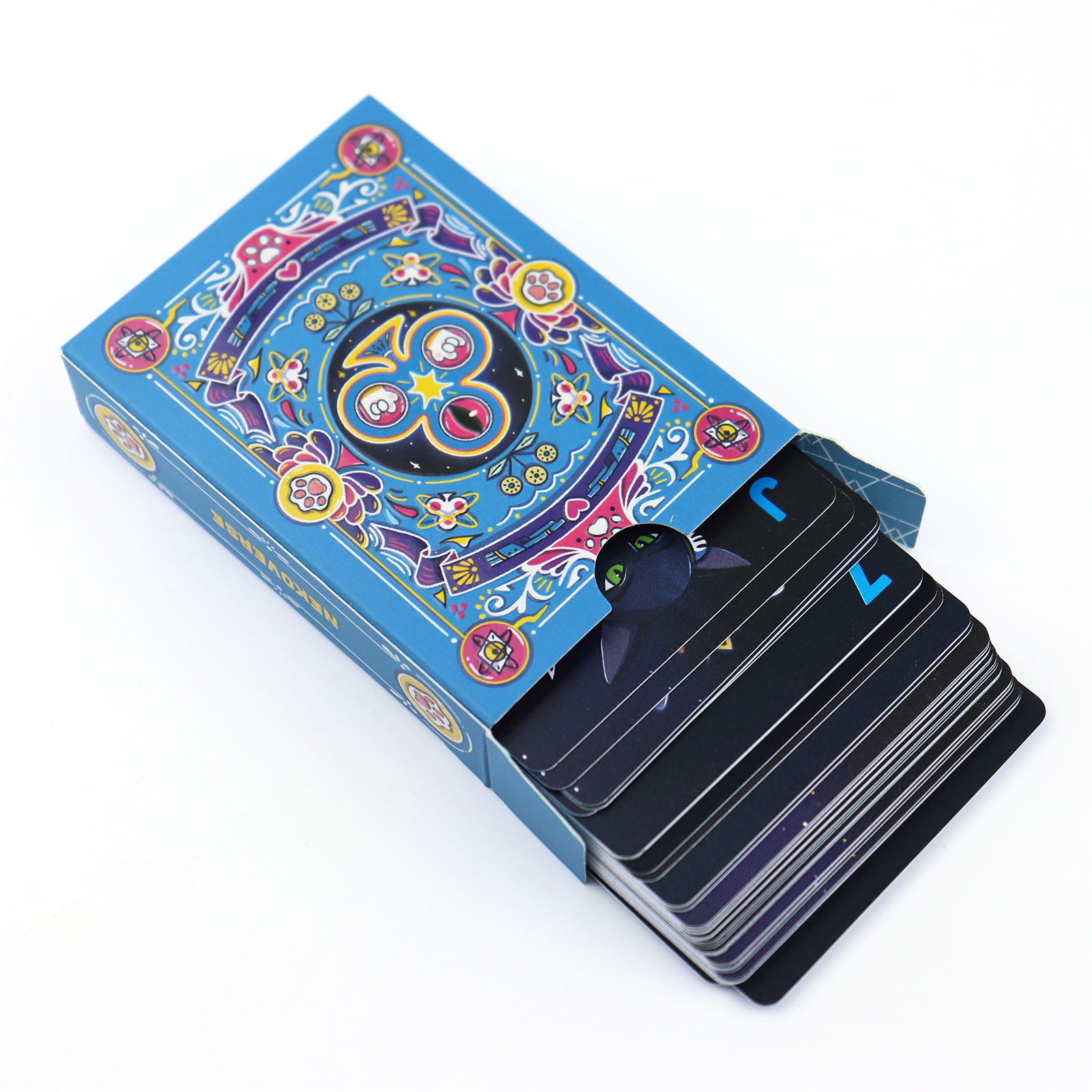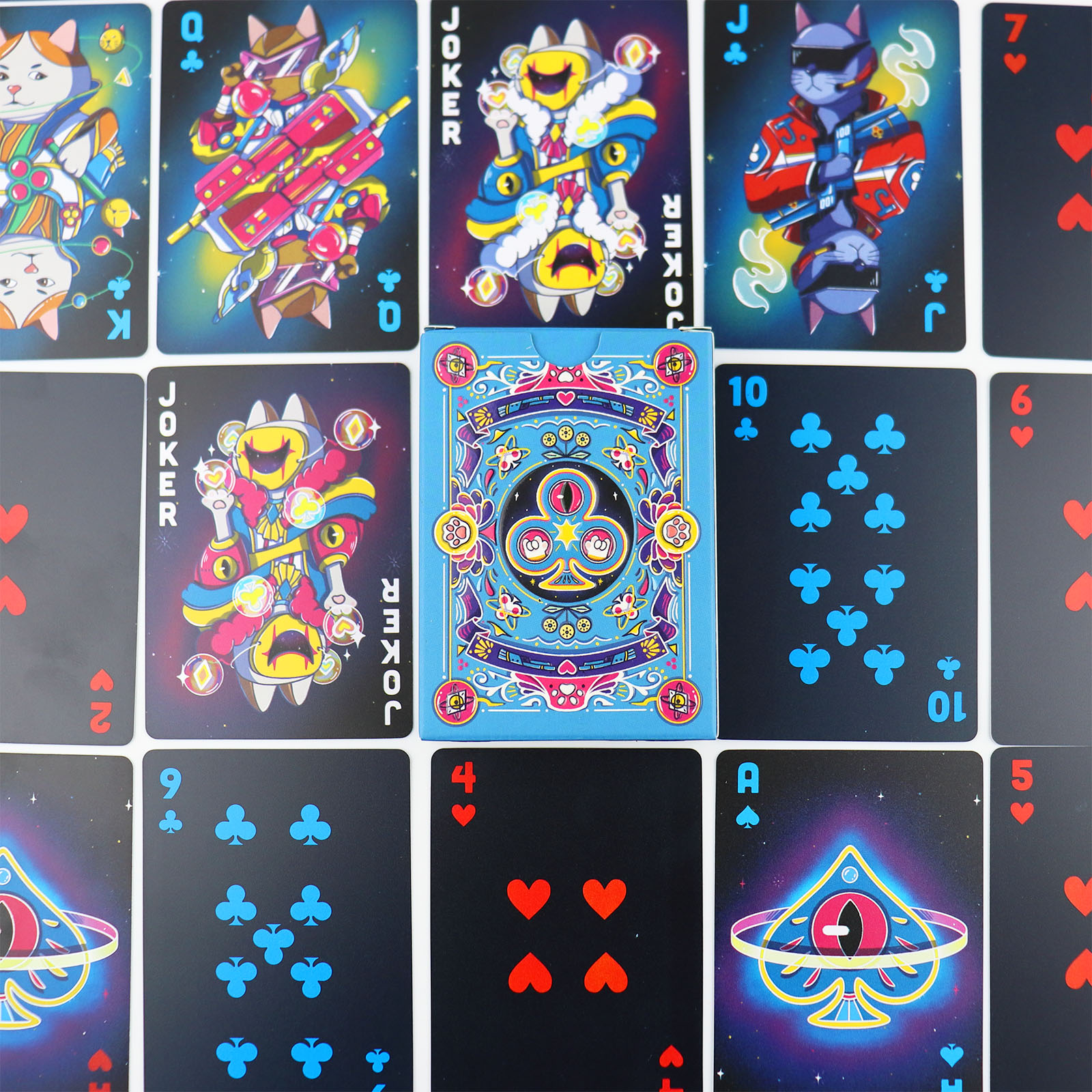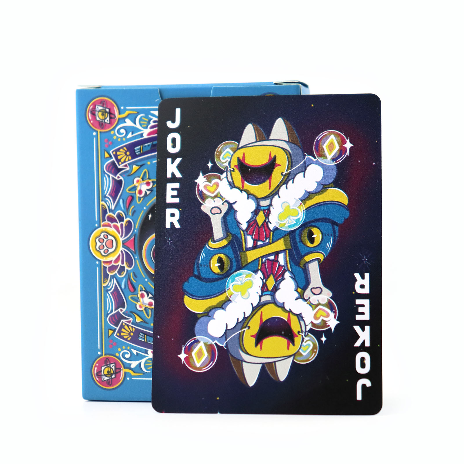 Inclusions & Design5. Complete set includes a deck of plastic playing cards with a custom blue - black fantasy theme: the box features elaborate blue artwork with colorful floral and symbolic patterns, while cards have unique designs (such as the vibrant Joker card with a dual - expression character, and suit symbols integrated with celestial or whimsical elements).6. The card back showcases the blue - hued intricate pattern with central eye - like or clover - shaped motifs, ensuring visual consistency and artistic appeal across the deck.