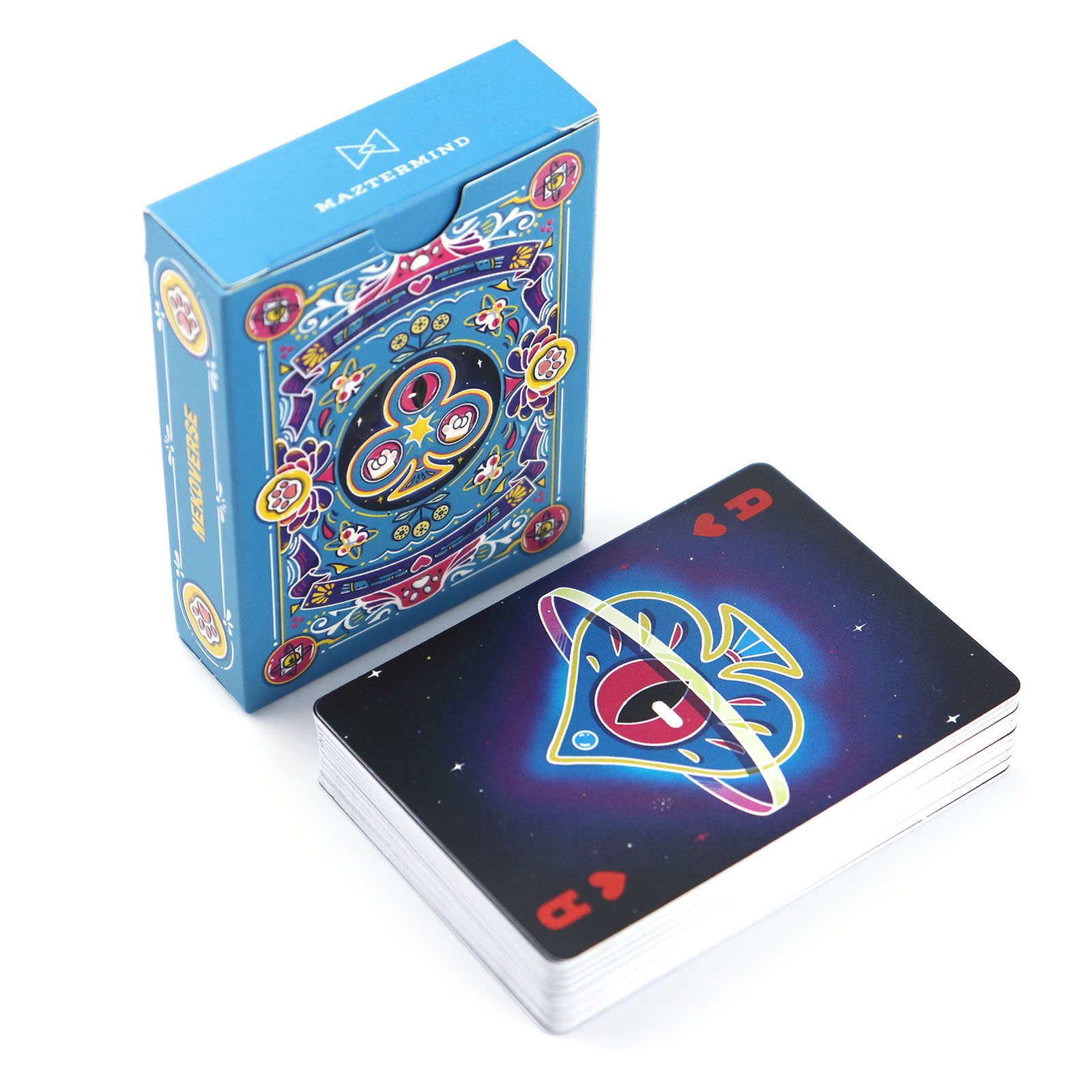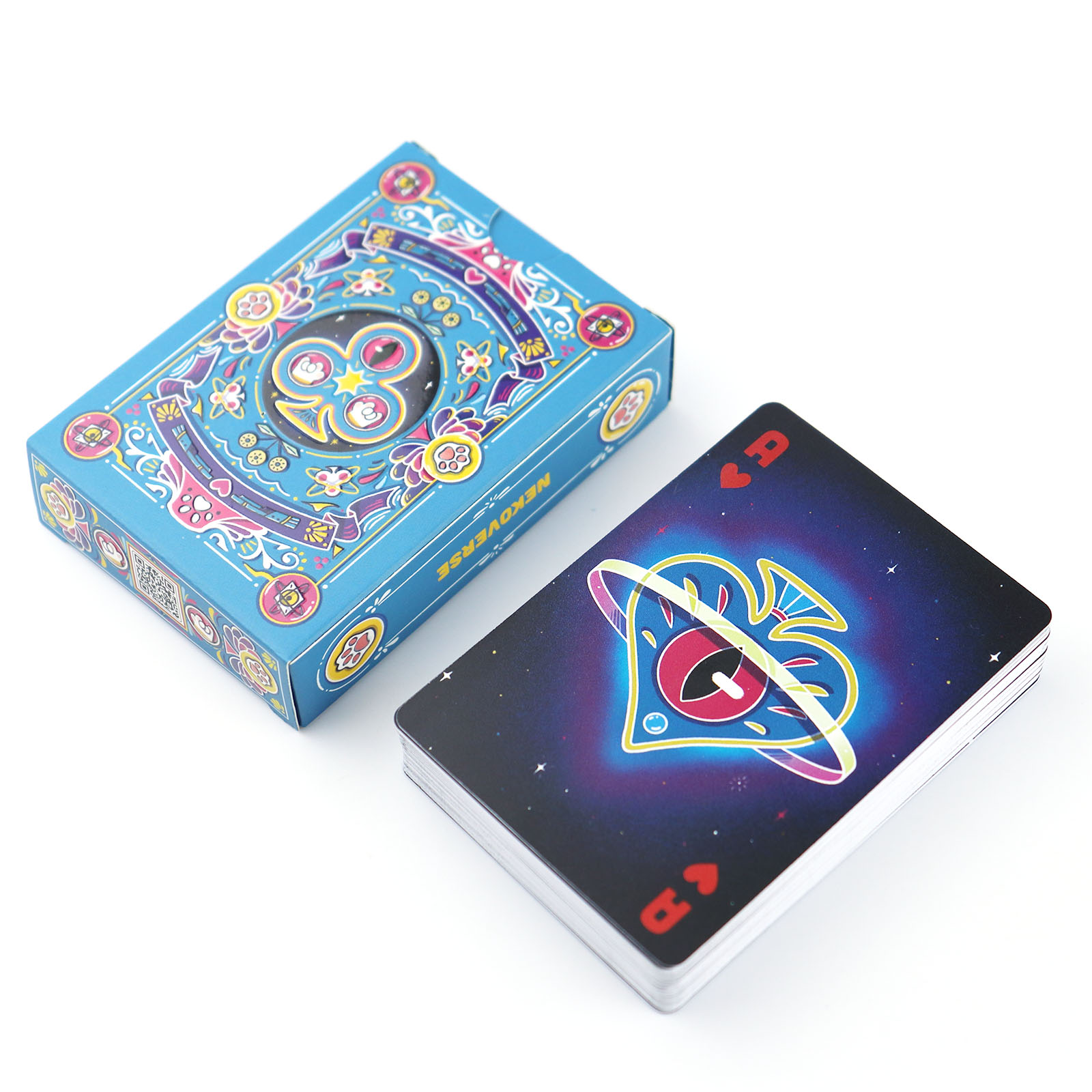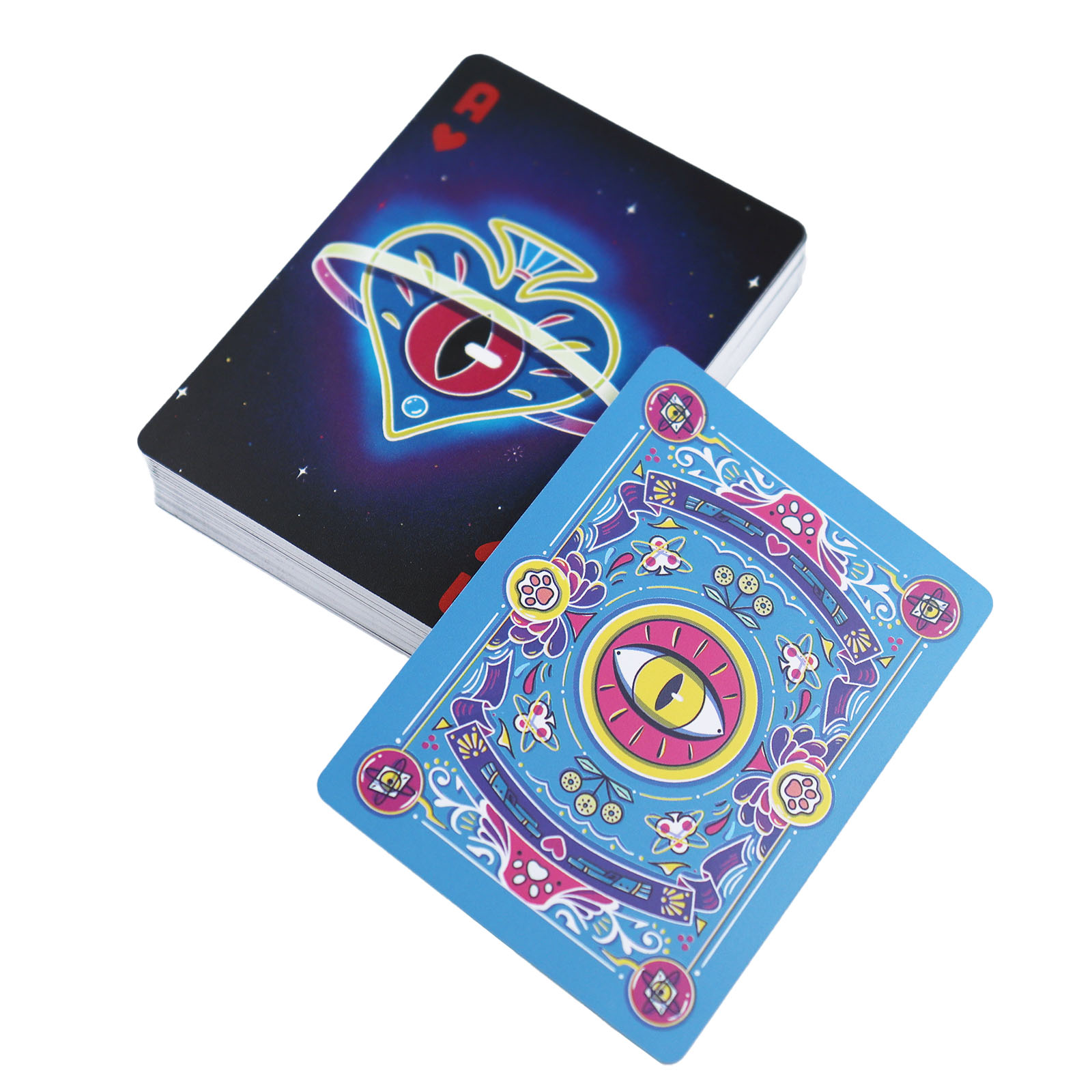 Inclusions & Design5. Complete set includes a deck of plastic playing cards with a custom blue - black fantasy theme: the box features elaborate blue artwork with colorful floral and symbolic patterns, while cards have unique designs (such as the vibrant Joker card with a dual - expression character, and suit symbols integrated with celestial or whimsical elements).6. The card back showcases the blue - hued intricate pattern with central eye - like or clover - shaped motifs, ensuring visual consistency and artistic appeal across the deck.