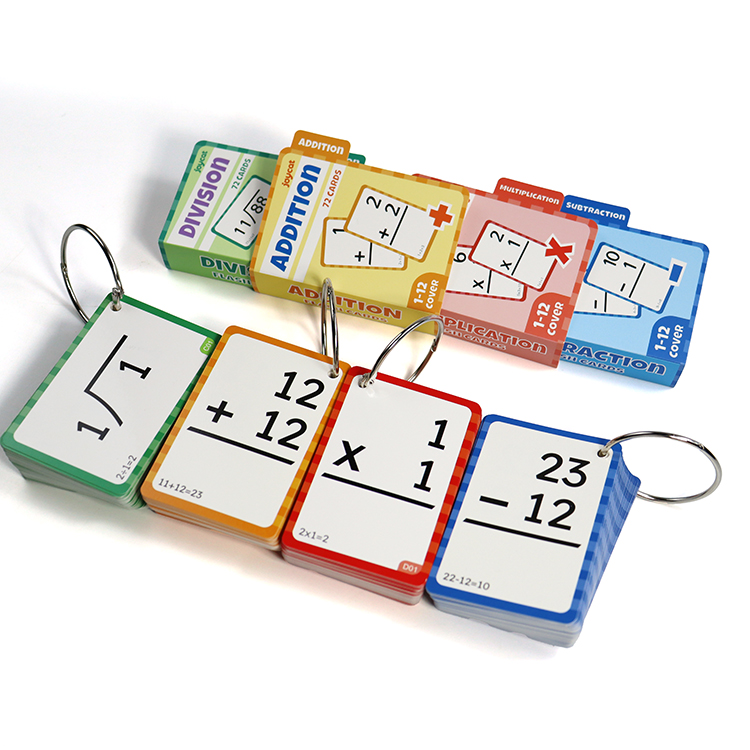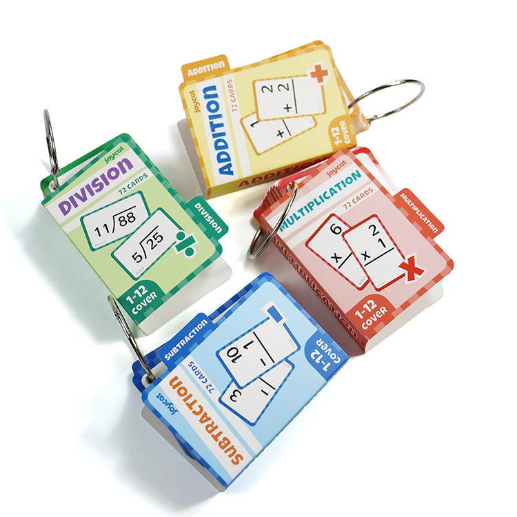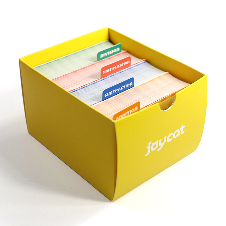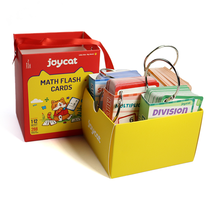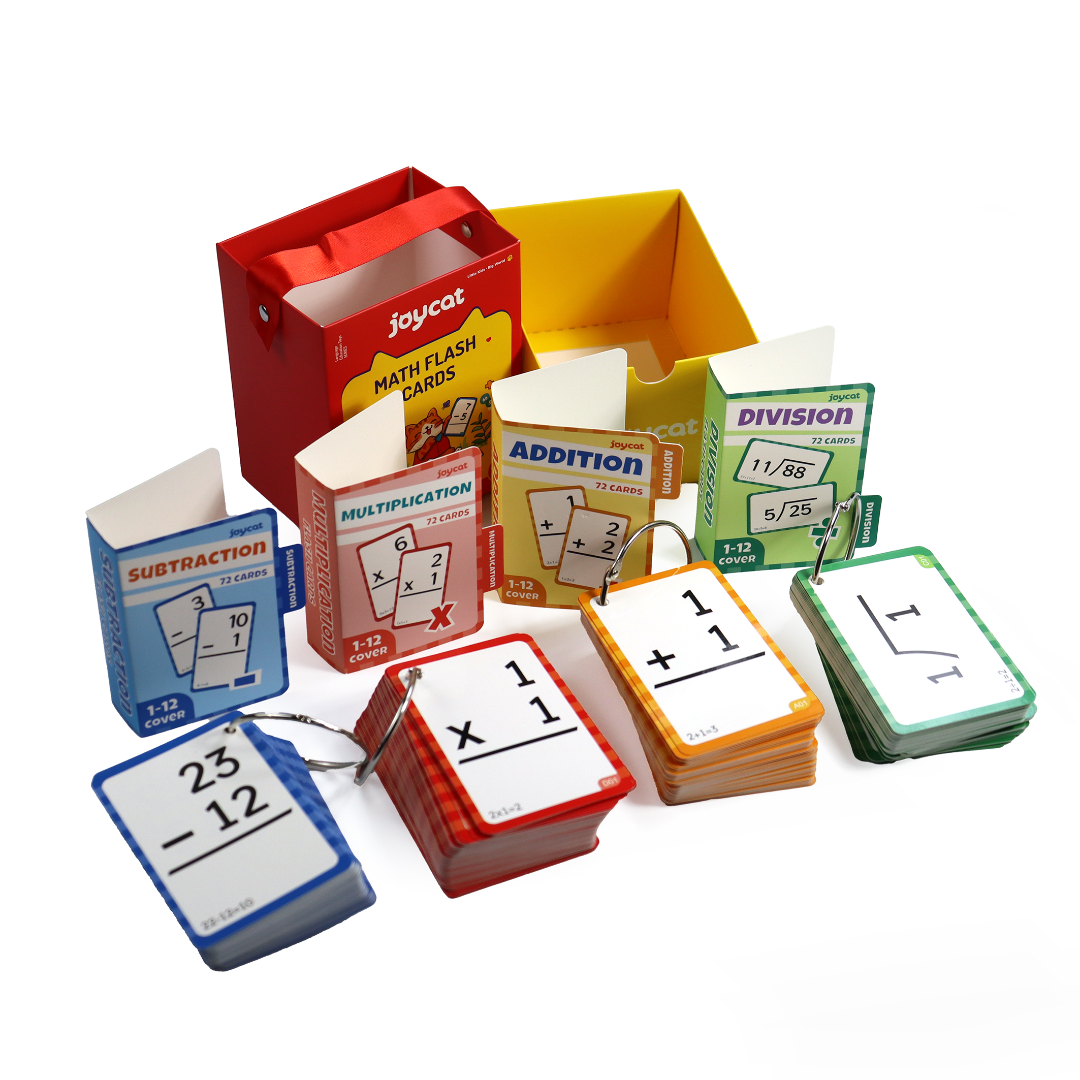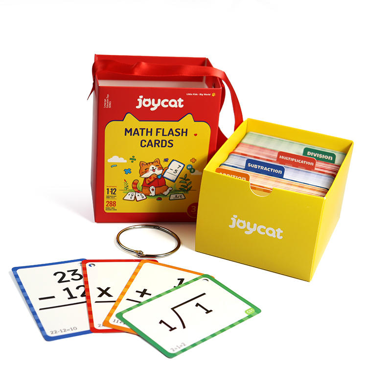 Inclusions & Organization5. Complete set includes four color - coded decks: Addition (orange), Subtraction (blue), Multiplication (red), Division (green)—each deck has 72 cards for comprehensive practice.6. Comes with a bright yellow storage box (with the “joycat” logo) to keep all decks organized, plus metal rings to bind cards for neat storage and easy flipping.
