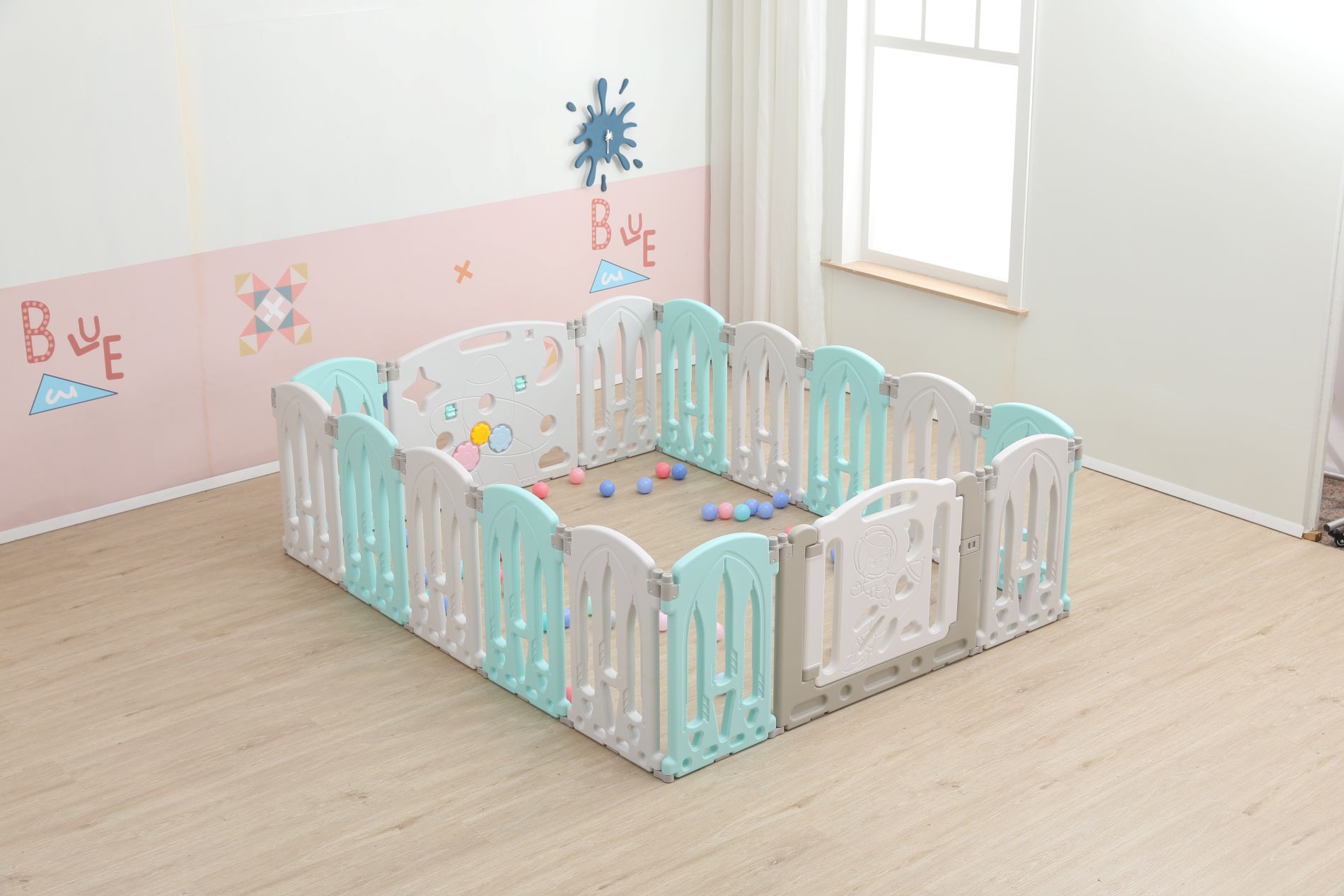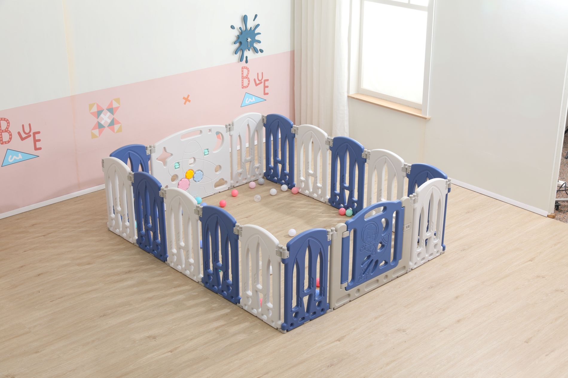 This is a children's safety fence inspired by rockets, featuring a pink and white color scheme with a fresh and cute style. The fence structure is stable and can enclose an independent baby activity area, ensuring safety during exploration. One of the fence boards comes with a fun game panel, paired with colorful ball pool elements, allowing babies to freely crawl and play in a safe space, as well as interact and explore through the game panel. It is a thoughtful item for creating a baby exclusive "space exploration little world" at home, solving the dual needs of baby activity safety and puzzle play for families.