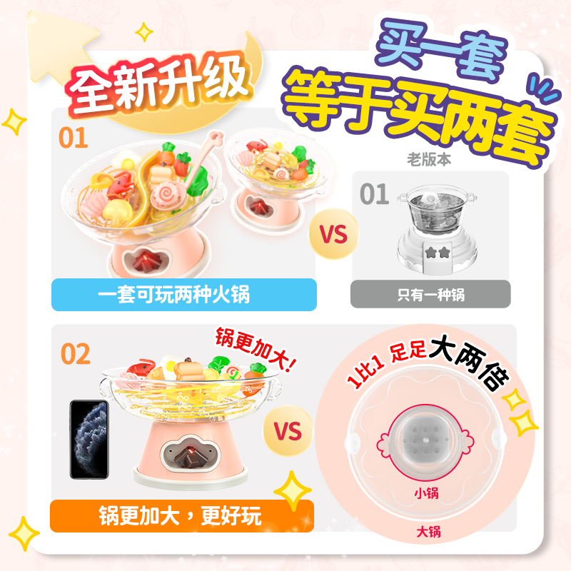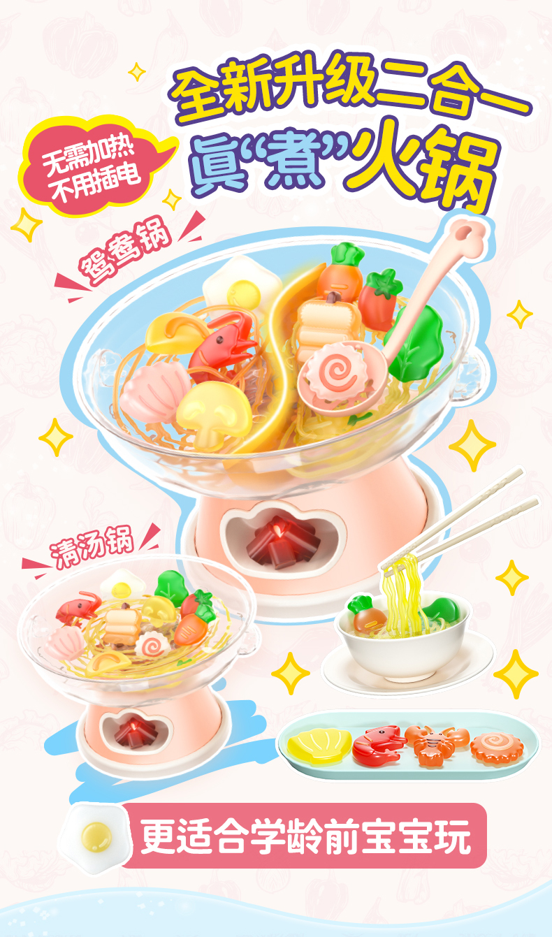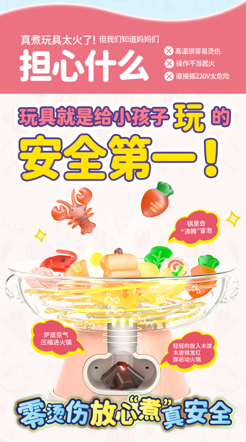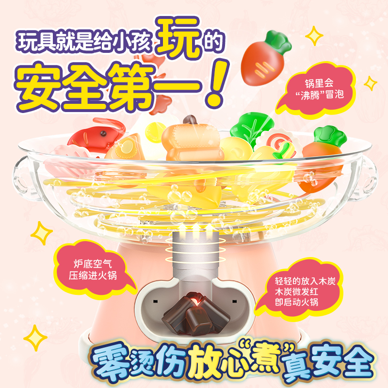 2. Realistic cooking and boiling simulation with bubbling effect (via air pump). No boiling water, safe and non-scalding. Add charcoal, turn on the stove, and watch the pot bubble. Complete with chopsticks and bowls for immersive play.