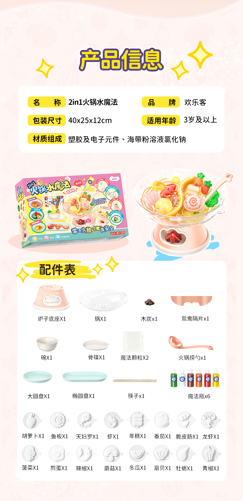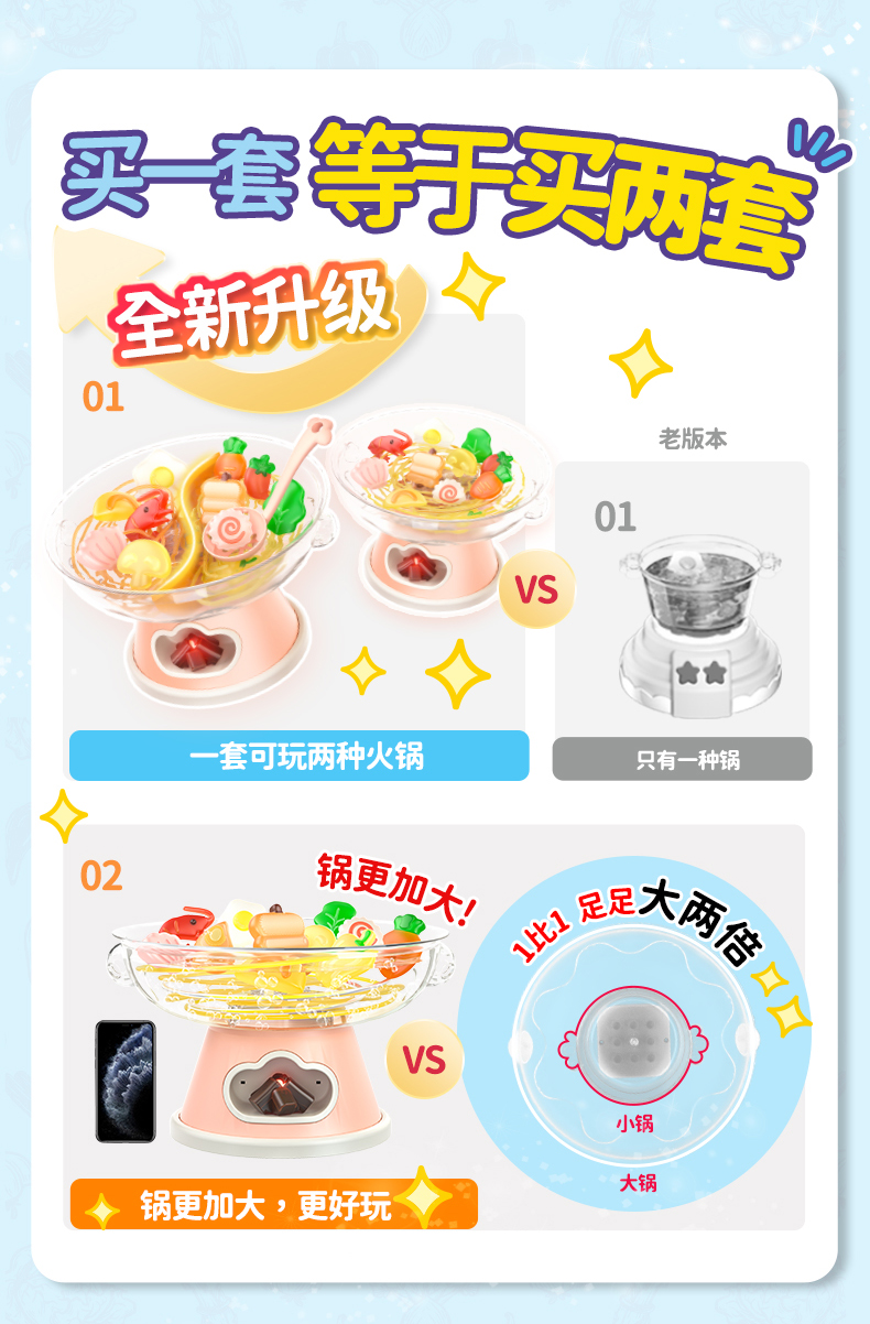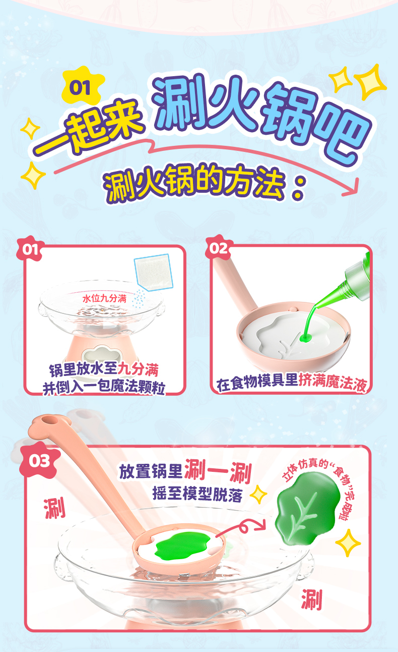 2. Realistic cooking and boiling simulation with bubbling effect (via air pump). No boiling water, safe and non-scalding. Add charcoal, turn on the stove, and watch the pot bubble. Complete with chopsticks and bowls for immersive play.