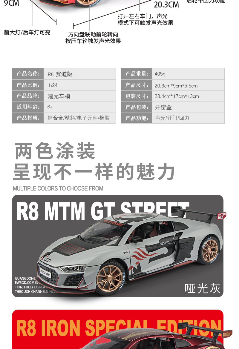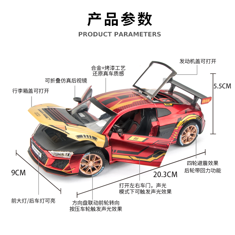 Multi-speed sound and light functions; recoil function; multiple doors can be opened; four-wheel shock absorption; foldable rearview mirrors; front wheel steering function