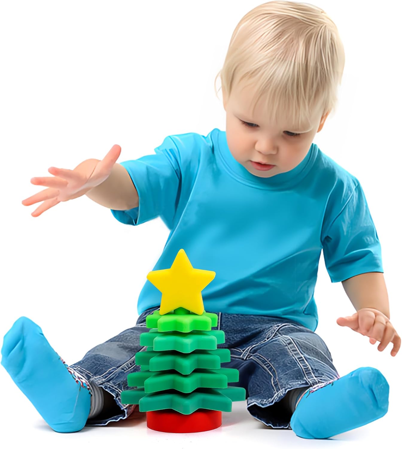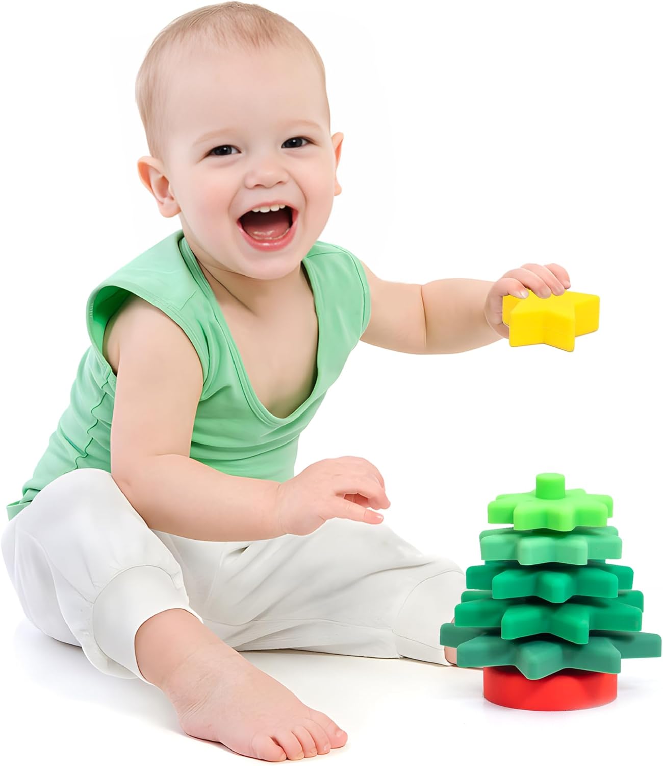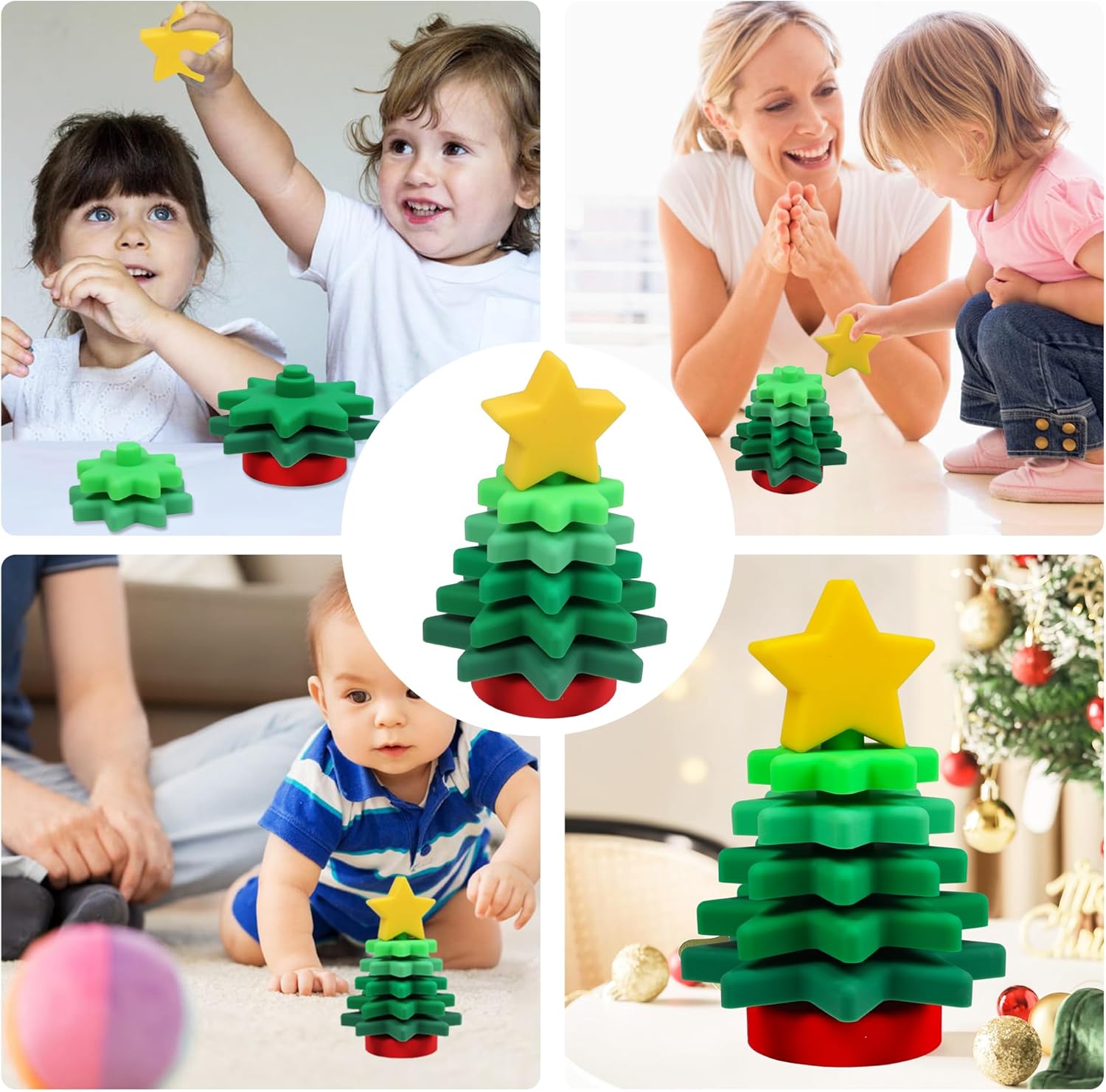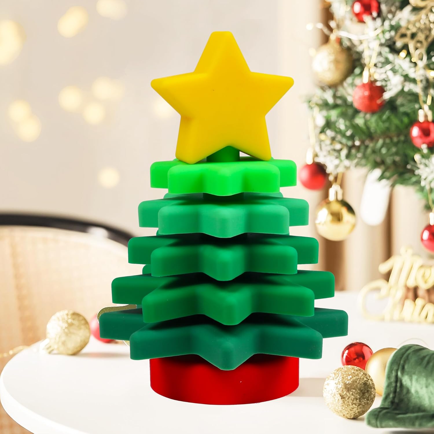 This silicone Christmas tree stacking toy is a festive educational goodie designed for young babies: Crafted from food-grade silicone, it features a soft, skin-friendly texture, is shatterproof and collision-resistant, and is safe and odorless even for babies to bite, providing reliable protection. The layered Christmas tree shape paired with gradient green colors, topped with a star decoration, helps babies recognize festive elements and colors, while the fun interaction of disassembling and stacking exercises their fine motor skills, spatial awareness and logical thinking. With rounded, burr-free edges, it fully protects babies’ delicate skin; it serves as both an educational toy and a bath water container, adding more joy to bath time. When stored, it can be assembled into a complete Christmas tree shape, taking up minimal space and being convenient for home display or travel. A stylish, safe and practical playmate for your baby’s growth.