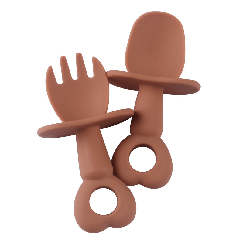 Baby silicone fork and spoon baby training heart-shaped short fork soft spoon children's food supplement tableware set cartoon style
