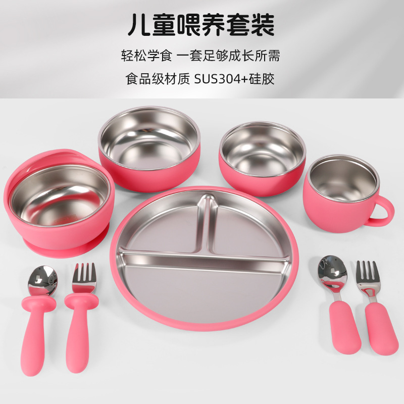 Stainless steel silicone dinner plate baby baby bowl tableware anti-fall water cup silicone dinner plate built-in stainless steel ten-piece set