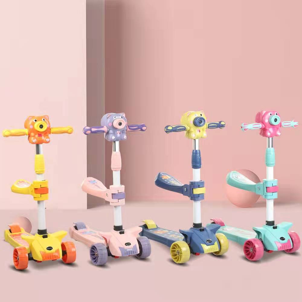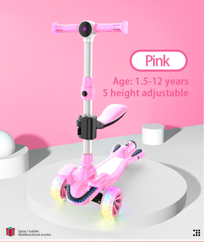 2 in 1 Spray Smoking Bubble Multi-Functional with Flip-Out Seat Adjustable Safe 3 Wheel Children Kids Kick Foot Scooter