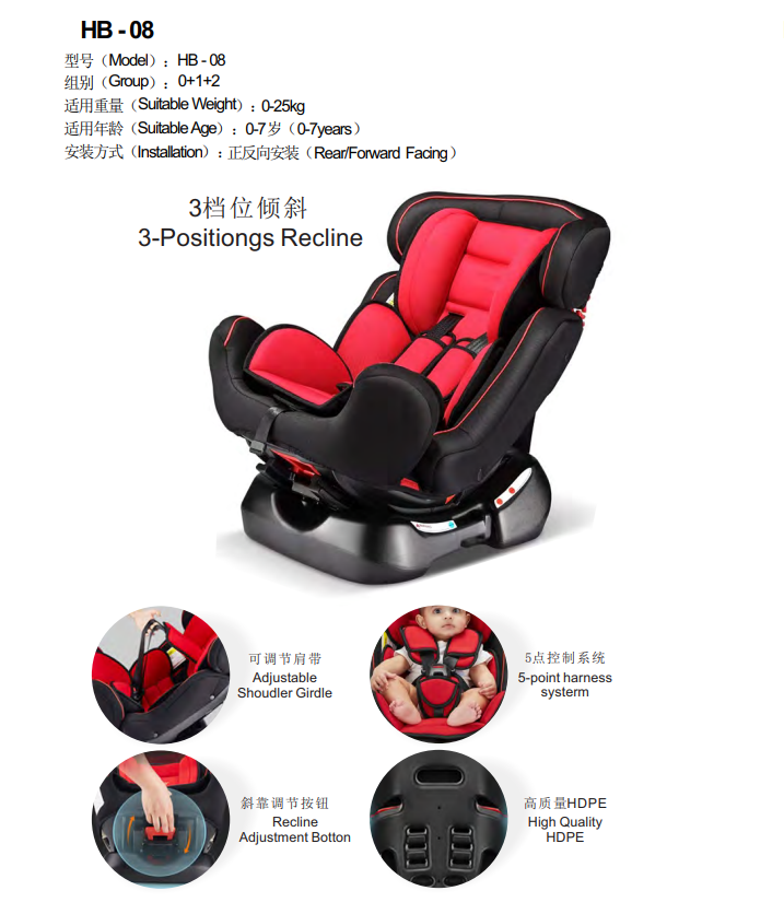 0-7 years,HB-08,children's car seat,GROUP 0+1+2,3-positions recline,ajustable shoulder cirdle