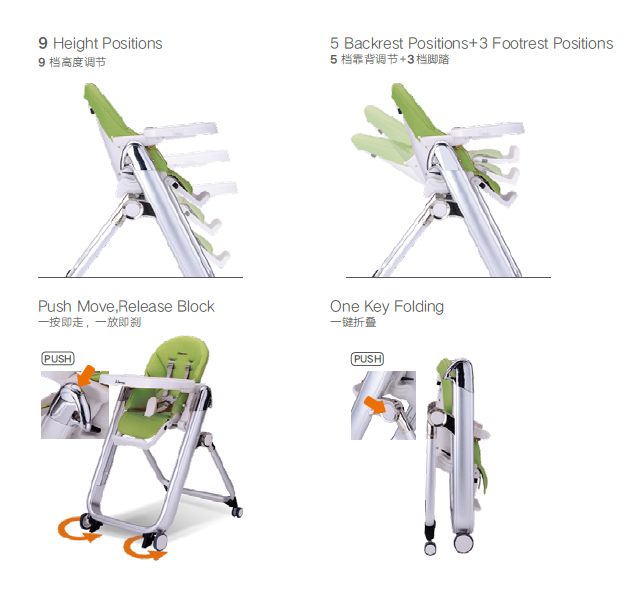 baby high chair,9 height positions, 5 backrest positions