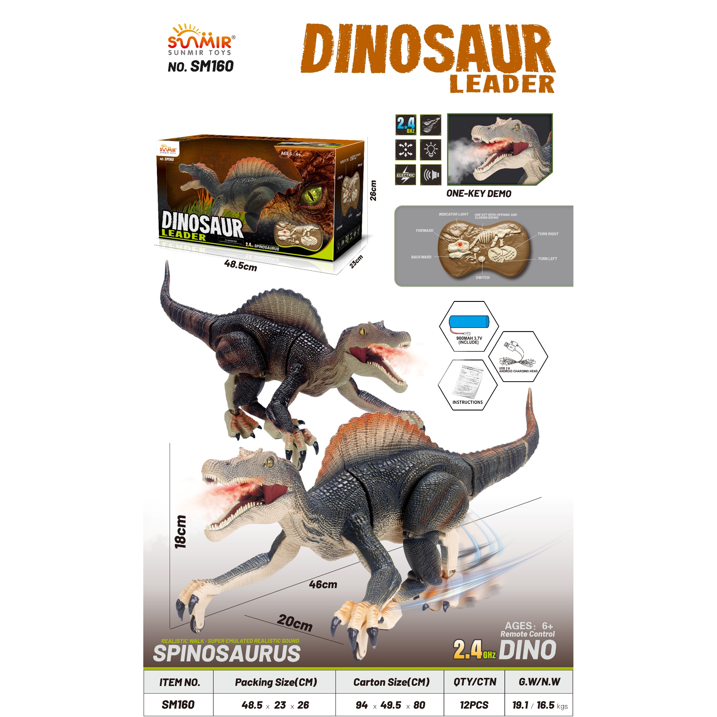 2 in 1 Infrared ray tracing + hand remote Intelligent Walking Spinosaurus Dinosaur With LED Light & Spray Water Mist + Roar Sound