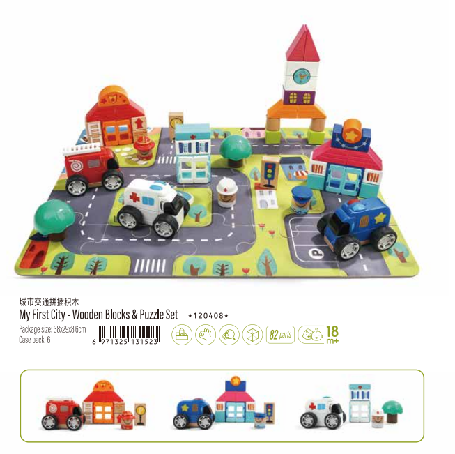 Colorful 12408 My First City Wooden Blocks and Puzzle Set Early Education Eco-friendly wooden toy with 80 pcs for kids above 18 Months