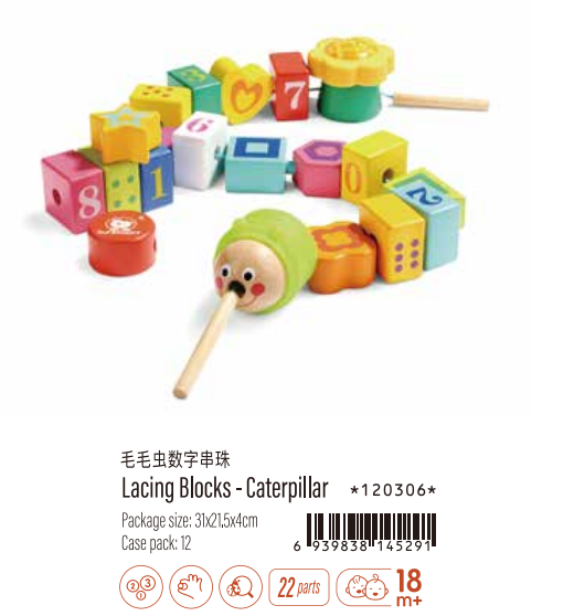 Colorful 120306 Lacing Blocks Catepillar Wooden Toy Early Education Early Learning Cognitive Training Quality-guaranteed educational toy with 22 parts 31X21.5X4cm for kids above 18 months