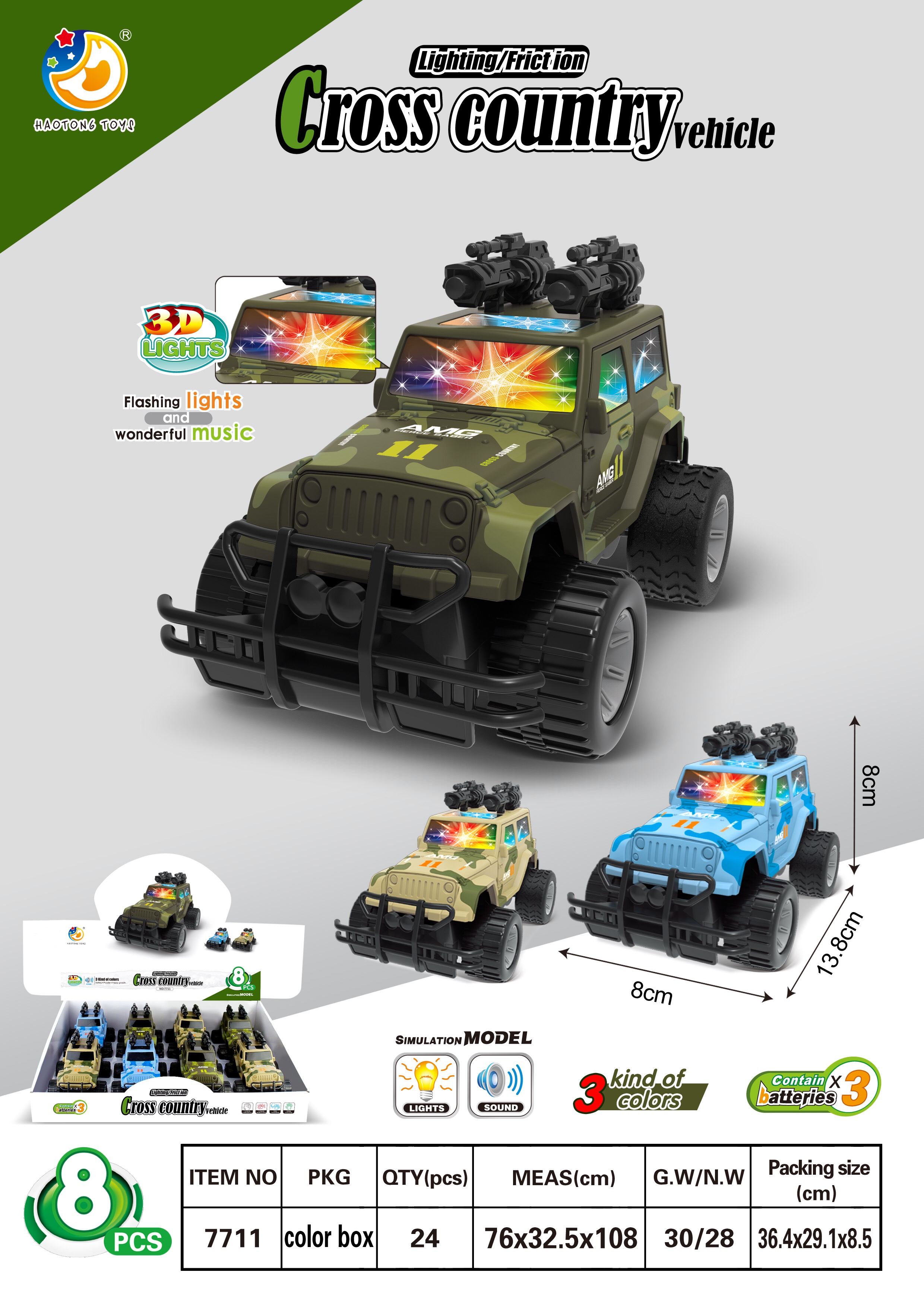 7711 Cross Country Vehicle with 3D flashing light and wonderful music plastic, diecast toys for kids above 3